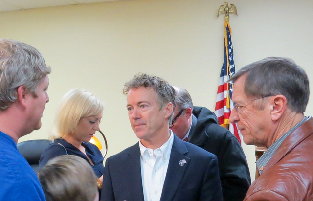 2016-02-18 - Basement, Adair Annex, 424 Public Square, Columbia, KY - Photo by Ed Waggener. Senator Rand Paul, back to camera, took time after the Town Forum to mix and mingle, above with Adair County CJE Mike Stephens, and left, his daughter LaGene Stephens Sexton, and right, PAC Chair Shannon Sexton. Senator Paul received a lavish introduction from Judge Stephens. - EW