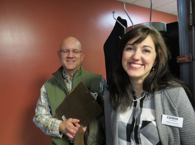 2016-02-18 - Adair Annex, 424 Public Square, Columbia, KY - Photo by Ed Waggener. Adair County political leader Tiffany Hadley Kessler, was smiling following what she assessed as a really good meeting, and later reported that her husband, Eddie Kessler, counted over 100 in attendance in a hall with seats for around 60 people - a pretty accurate figure, considering people were standing around the walls and out into the hallway. Behind her is a Rand Paul volunteer, Beaver Corder of Somerset, KY. Tiffany Kessler is the Eastern Region, 1st Congressional District of Kentucky, campaign coordinator for former Kentucky Commissioner of Agriculture Jamie Comer.