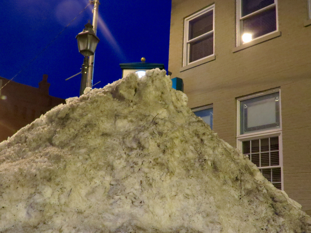2016-02-18 - Public Square, Columbia, KY - Photo by Ed Waggener. This snow mountain created by the Columbia Street Department could be hanging around, waiting for more, but already, some professional in the prophesying business have privately told us that winter is over. The question is, how long before this mountain melts? And don't we always have a one day blizzard in March? One that goes from one of North Dakotan fierceness, blowing blinding snow and creating what looks like the new ice age for a couple of hours, then melts by sundown? Or is that just remembering big. -EW