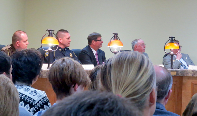 2016-02-18 - Adair Annex, 424 Public Square, Columbia, KY - Photo by Ed Waggener, CM photo. Dignitaries, seated at the elevated platform in the basement community hall in the Adair Annex, are, from left, Adair County Sheriff harrison Moss, Columbia Chief of Police Jason Cross, Lindsey Wilson President Bill Luckey, Columbia Mayor Curtis Hardwick, and Bryan Mills, Senator Rand Paul's representative for this area of Kentucky. The photo was taken last night, at Sen. Paul's Town Hall Forum, on Wednesday, February 17, 2016