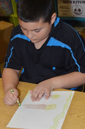 CES second-grader Brayden Paiz colors the pattern in his rainforest scene. - Calen McKinney, CIS