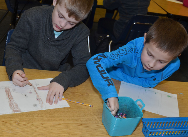CES second-graders Cash Cowan, at left, and Grayson Dooley color their rainforest scenes. - Calen McKinney, CIS