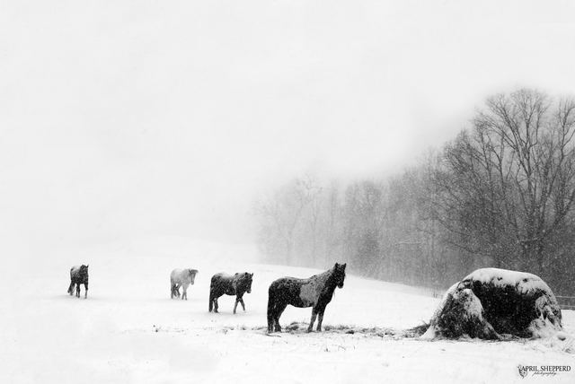 "The snow was causing a near white-out while our four horses, Midnight, Rummer, Shiloh, and Jackson, were coming into the stable for feed and peppermint treats. This photograph was taken at TifBay Stables on Lookout Road in Columbia," April Shepperd of Columbia, KY writes of this photo - one of many she took in the past few days.