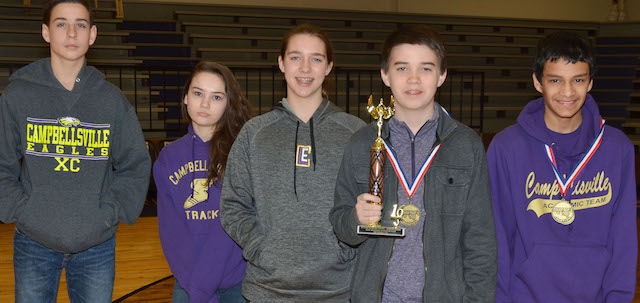 2016-02-17 - Photo by Calen McKinney. Campbellsville Middle School academic team members competed at regional Governor's Cup on Tuesday, Feb. 9, and Saturday, Feb. 13. The CMS problem solving team finished in second place and eighth-grader Ben Arachi received second place in the science exam. As a result of their top finishes, the students now advance to the state Governor's Cup, which is set for March 19-21 in Louisville. From left are seventh-grader John Orberson, eighth-grader Savanna Brockman, seventh-grader Abi Wiedewitsch and eighth-graders Cole Kidwell and Nate Arachi. Orberson, Brockman, Wiedewitsch and Kidwell are FPS members.