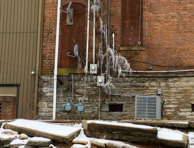 2016-02-14 - Rear of Jeffries Building, 228 Public Square, Columbia, KY - Photo by Linda Waggener, CM. Caught this icicle art, photographed from the back of the Jeffries Building, aka Radio Shack Building, now coming under the ownership of Lindsey Wilson College. The snow in the photo reminded me of Granddaddy Marcum's saying when looked out over the last of a snow. He'd say, "That snow is just hanging around, waiting for more." Quite wise of course, when the days were like this Sunday, when, according to the National Weather Service, more snow will arrive after 10amCT, today (the snow is already falling as this is written, barely past 7amCT). The photo, by the way, is from the back side, the Reed Street Side of the Building. And, by the way, Lindsey Wilson has already started the renovation on the roof. The renovation of any Downtown Building is significant, but this one is major, and is anticipated to be THE big turning point for the Square. It's the first presence for Lindsey Wilson in the Downtown, which many believe will accelerate the visions of a revival for the district as at no other time. - LW