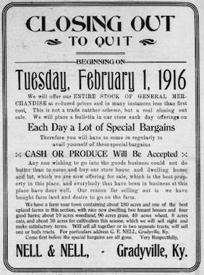 Found this while working on another subject, but thought it needed some light of day on a cold February morning. Nell & Nell, Gradyville, from the Adair County News, 9 February 1916, only a century ago! Going out of business ad. Nell & Nell was an institution around Gradyville for many years at the turn of the last century. - Mike Watson