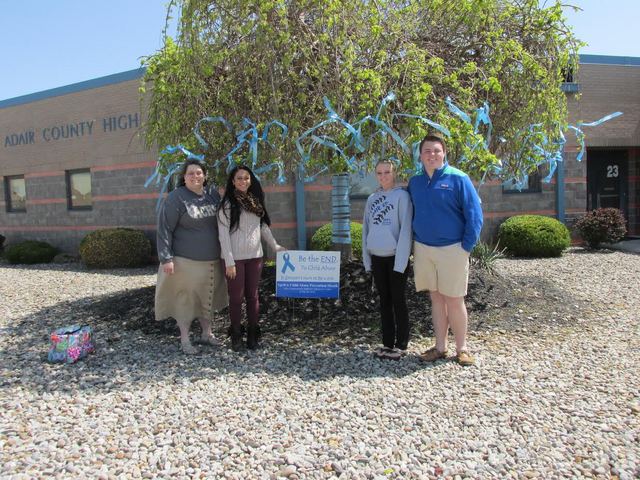 2015-04-22 - Adair County High School, 526 Indian Drive, Columbia KY - Photo by Amy Price. In this photo we have the Adair County High School SADD (Students Against Destructive Decisions) sponsor and officers: Rebecca Smith - sponsor; Katrina Rodgers - vice president; Jeralyn Kessler - president; and Austin Hatcher- public relations, with the tree they decorated with blue ribbons to dramatize the effort to stop child abuse. - AMY PRICE