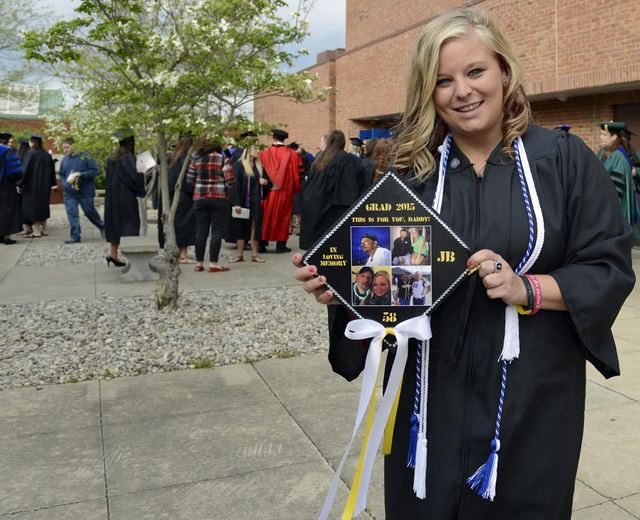 2015-04-22 - Biggers Sports Center, 360 Spickard Drive, Columbia, KY - Photo by Duane Bonifer, Lindsey Wilson College. Lindsey Wilson College senior Ashlie Bishop of Elkton, KY, displays her mortarboard, which is dedicated to her late father, Jim. Jim Bishop died September 22, 2015, a little more than a month after being diagnosed with cancer. Bishop - who participated in LWC's Honors Convocation Tuesday afternoon at Biggers Sports Center - has a brother, James, who will graduate from Todd County (KY) Central High School this year. - DUANE BONIFER, Lindsey Wilson College.