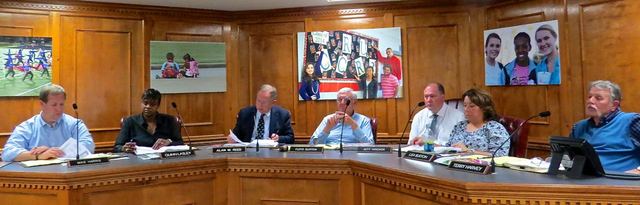 2015-04-17 - 1204 Greensburg Street, Columbia, KY - Photo By Ed Waggener. From Left, Board Members Mike Harris (Division 5), Quin Lasley (2), Superintendent Alan Reed, Board Chairman Floyd Burton (4), Board Attorney Jeff Hoover, and Board Members Lisa Burton (3) and Terry Harvey (1).
