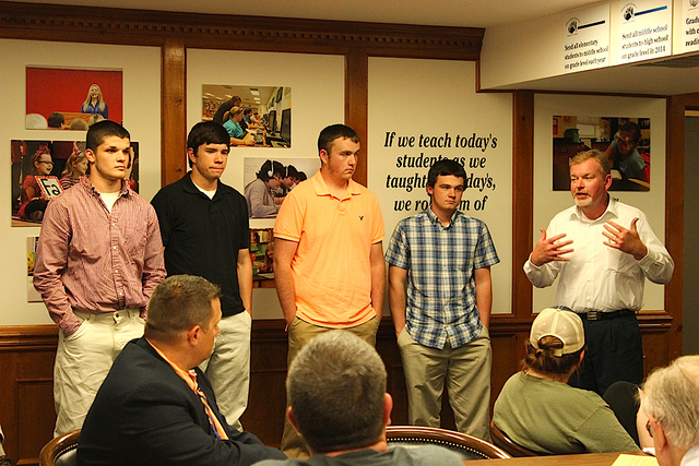 2015-04-17 - 1204 Greensburg Street, Columbia, KY - Photo by Shamarie Claiborne, Adair County School District. Barney Taylor, welding instructor at the Adair County Career Tech Center, told the Board of Education that the young men who make up the Welding Fabrication Team are history making. The team won first place in Regional Skills USA competition in Somerset, KY and will compete in Louisville later this year. The team is Chad Scholl, Dusty Claiborne, and Joshua Grant. The team will compete at the State Skills USA competition next week. On the far left is Dakota Price who has already become a certified welder qualified to work with Kentucky Department of Transportation. - SHAMARIE CLAIBORNE.