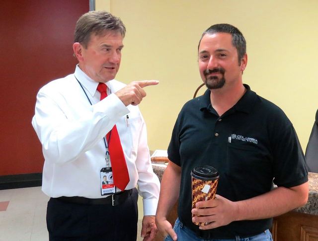 2015-04-15 - Adair Annex, 424 Public Square, Columbia, KY - Photo bu Ed Waggener. After the serious matters were concluded at Adair Fiscal County, Tuesday evening, April 14, 2015, Judge Stephens joined in a bit of humor pointing a finger at Columbia Controls CEO Matt Baker. Baker has built Columbia Controls into one of Kentucky's leading electronic security firms specializing in jail electronics systems. He's been one of the leading proponents of revitalizing the Square, and provided a strategic turing point in the fortunes of the Historic Adair County Courthouse, when leased space at a rate which pays nearly a third of the buildings annual maintenance budget, choosing Columbia over several other communities bidding to recruit the promising firm. - Ed Waggener