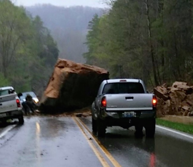 2015-04-15 - KY 1274 between Mt. Sterling to Morehead, KY - Photo by Wanda Birchfield, courtesy Jr. Stotts News Service. A huge boulder landed in the middle of Highway 1274 toward Morehead, KY, blocking traffic in each direction. The road was reopened at about 7pmET last night, April 14, 2015. - JR STOTTS