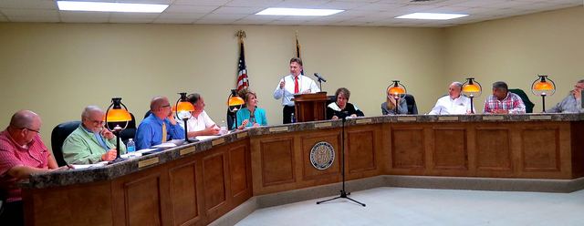 2015-04-15 - Adair Annex, 424 Public Square, Columbia, KY - Photo by Ed Waggener. Breeding Area Volunteer Fire Department Chief Terry Harvey advocated for the inclusion of fire department's annual dues on Adair County Tax Bills. Chief Harvey fielded questions from the court, including whether or not the Adair County Fire Department in Columbia will or could be included in the billing. CJE Mike Stephens said it was his opinion that they could be, but the fire department would need to request inclusion. Magistrate Daryl Flatt, who urged more study on the proposal, wondered out loud if, once the dues are included, by ordinance, what would stop the departments from raising fees when they pleased. CJE Stephens noted that that might be possible, but gave the opinion that the Fiscal Court could rescind the ordinance at any time. Chief Harvey's department is one of the best equipped in the state, but he emphasized that his department has attendant maintenance responsibilities, and the added revenue the department would receive by putting the dues on the tax bill would help to maintain the Fire Station and apparatus, and help the department better equip individual firefighters.
