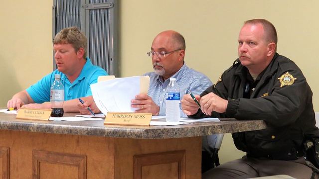 2015-04-15 - Adair Annex, 424 Public Square, Columbia, KY - Photo by Ed Waggener. Adair County Regional Jailer Joey White present his report for jail operations for March 2015, as Adair County Treasurer Barry Corbin studied papers and Adair County Sheriff Harrison Moss listens.