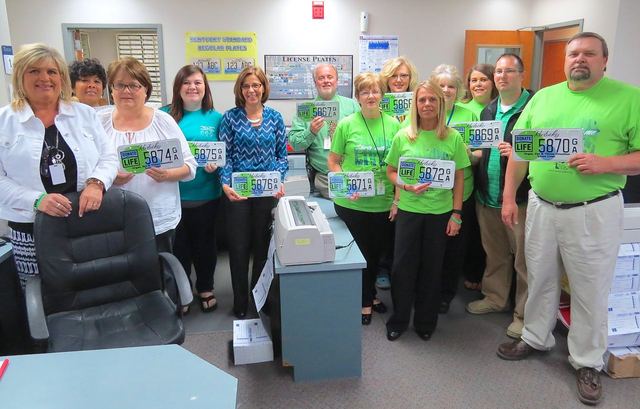 County Clerk Lisa Greer, far left, with, deputies Lisa Lasley, Rebecca Rogers, MacyFeese and Sonja Reeder, and Circuit Court Clerk Dennis Loy, and Deputies Holly Jessie, Jane Breeding, Linda Jackson, Annetta Burton, Josh Withers, Kim Montgomery David Giles, hold Donate Life License Plates which are now on sale in the County Court Clerk's office in the Adair Annex, 424 Public Square, Columbia, KY, Mondays through Fridays, 8am-4pmCT, and Saturdays 8:30am-12pm noon CT. A portion of each plate sale goes to the Circuit Court Clerk's Trust for Life. Trust for Life Plates are $44 at issue, $31 at renewal. If personalized, at issue, the plates are $69.00, at renewal $56. - LISA GREER