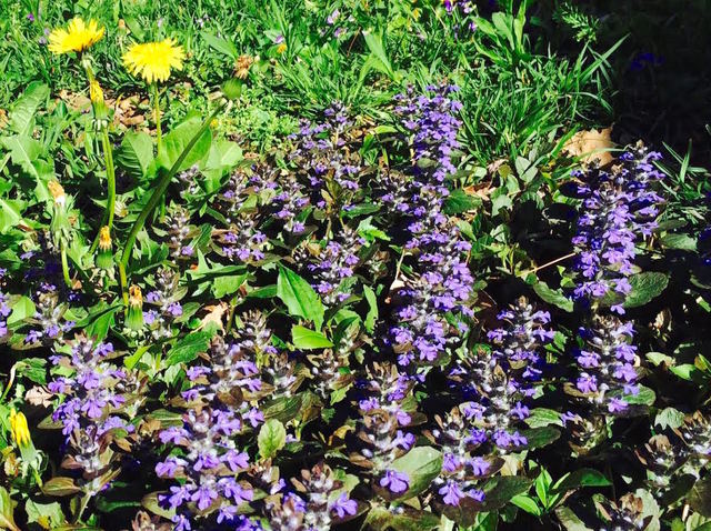 2015-04-13 - Adair County, KY - Photo CM photo. Ajuga, or Bugleweed a member of the mint family, was quite the landscaping item 40 years ago. Bees love it - especially bumblebees. It's opportunistic ways - it thrives whether one wants it to or not, is often held agains it. Does anyone know if a lawn could be taken over by it? And whether, as a member of the mint family, it is edible? - CM