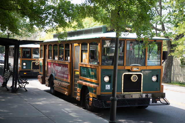 Trolley buses run for free all day in downtown Charleston.