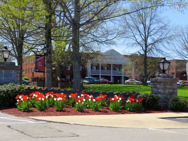 2015-04-12 - Campbellsville University, Campbellsville, KY - Photo ColumbiaMagazine.com staff photo. Red tulips and white tulips theme the campus of Campbellsville University. This scene is at the entrance to the Maple Trail and overlooks historic Stapp Lawn with Stapp Hall in the background. The lawn is aesthetic and functional. Students and visitors enjoy picnics on the treehouse deck, and the giant statuary hewn from giant tree trunks. The statuary can be at one time stylistic and a bit amusing, and on the other, deeply spiritual and symbolic. - EW
