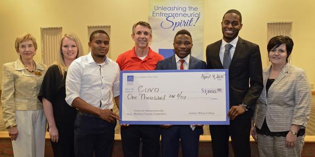 2015-04-10 - Norma & Glenn Hodge Center for Discipleship, 402 Helen Flatt Drive, Columbia, KY - Photo by Duane Bonifer, Lindsey Wilson College . Members of the award-winning Convo team display a facsimile check for $1,000 after winning first place in the fourth-annual Lindsey Wilson College Business Concept Competition, held Thursday at Norma and Glen Hodge Center for Discipleship. From left: LWC Center for Entrepreneurship Linda McKinley-Grider; judge Kristen Sexton of Taylor County (KY) High School; Convo team member Elijah Ukpong of Lagos, Nigeria; judge David Stewart of Institute of Lean Systems; Convo team members Pacific Mutayongwa of the Democratic Republic of Congo and Greg Young of Nashville, Tenn.; and judge Jennifer Flatford, Walmart human resources manager. Not pictured: Convo team member Billal Qsiyer of Illzach, France. - DUANE BONIFER, LWC