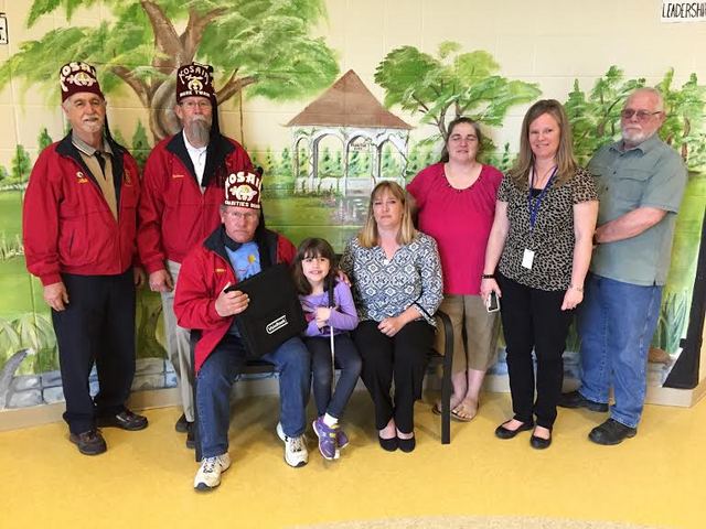 2015-04-10 - Columbia, KY - Photo from Robert Flowers, Mark Twain Shriners . Last month, the Mark Twain Shrine Club and Kosair Charities were proud to make a presentation to a student at the new Adair Co. Primary School. Jenna Claywell, who is visually impaired received a "Visiobook" to assist her with her studies. The device is used by inserting a book or picture into a compartment and enlarges the image on a screen. Jenna is a very bright young lady and was so greatfull for the gift. Shriners present were. Bill Hart past president, Richard Shival past president and seated with Jenna and her mom Misty Claywell is Robert Flowers, past president and Treas. of Kosair Charities. Also present was Telisa Moore, instructional asst., Laura Reed, Visual Instructor and of course, Grandpa Bill Nobles, also a Shriner. Kosair Charites and the local club take great pride in being able to make these things happen, largely through your donations and an excellent staff in the Adair Co School System to keep us apprised of these needs. Thanks, Robert W. Flowers.