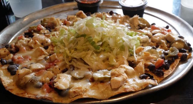 2015-04-10 - Nacho Royale, 439 King St, Charleston, SC 29403 - Photo by Pen. Nachos Royale with chicken, from Juanita Greenberg's Nacho Royale on King Street in Charleston, SC. They serve them on crispy flour tortillas. You have to un-order Pico if you don't like it. Who doesn't, though. The dish has Monterey Jack Cheese, Jalapeņos, black beans, and it's topped with sour cream. And those cups have salsa and sour cream. Pretty good for $9. - EK. If you run down for lunch or dinner from Columbia - might want to wait a day or two: It's about 8 hours from the Historic Courthouse on the Square in Columbia, KY.