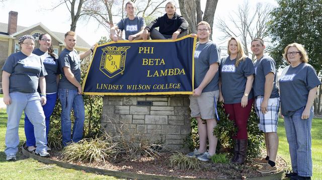 Lindsey Wilson College students started a chapter of Phi Beta Lambda business fraternity so they could put into practice what they learn in the classroom. From left: students Amy Beane of Russell Springs, KY; Hillary Bumpus of Providence, KY; Travis Evans of London, KY; Michael Robinson of Little Rock, Ark.; Caio da Cruz of Sao Paulo, Brazil; Lane Thompson of Sulphur Well, KY; Katherine Dickerson of Louisville, KY; Jordan Blair of Columbia; and LWC Associate Professor of Business and Economics Trudy Morlino, chapter adviser.