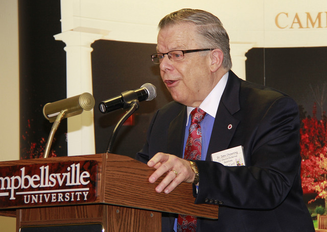 2015-04-02 - Campbellsville, KY - Photo by Rachel DeCoursey, Campbellsville University. Dr. John Chowning, vice president for church and external relations and executive assistant to the Campbellsville University president, welcomed everyone and introduced Al Cross as the guest speaker.