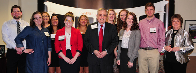 2015-04-02 - Campbellsville, KY - Photo by Stan McKinney, Campbellsville University. Campbellsville University's Media Appreciation Luncheon was hosted by the Office of CU Communications. From left: Drew Tucker, communications assistant; Kyle Perkins; Joan C. McKinney, news and publications coordinator; Shelby Hall; Jilly Benningfield; Hanna Hall; Al Cross, director of the institute for rural journalism and community issues at the University of Kentucky; Kasey Rickets; Samantha Clark; Jordan Snider; Josh Christian; and Linda Waggener, marketing and media relations coordinator.