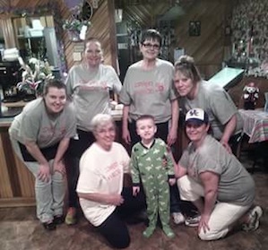 2015-03-27 - Columbia, KY - Photo by Sherry R. Williams. Conner's Homecoming: he stopped by Betty's OK Country Cooking where he was greeted by "Conner's Warriors", (left to right front) Betty, Conner, Susan (left- right back) Brittany, Jessica, Ruth, Debbie. Conner had been hospitalized since January 1st 2015.
