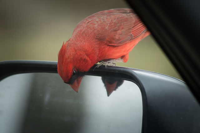 2015-03-27 - Shelby Co., KY - Photo by Pen. A cardinal, taking exception with his handsome rival on the other side of the mirror.