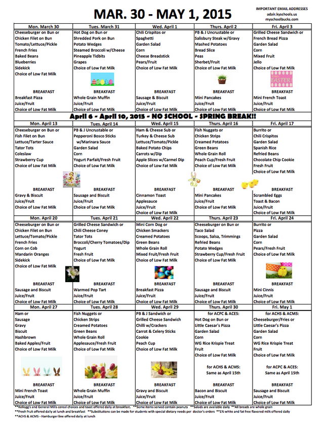 Adair Co. School District Menu Mar. 30 - May 1, 2015