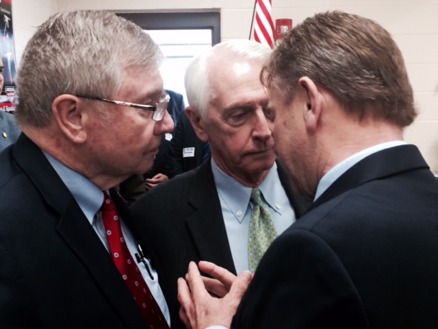 2015-03-25 - Adair County High School, 526 Indian Drive, Columbia KY - Photo by Larry Smith, FM 99.9 The Big Dawg, FM 92.7 the WAVE. From left, Former Adair County Judge Executive Richard Lee Walker, Governor Steve Beshear, and Adair County Judge Executive Mike Stephens, chat in a hallway of Adair County High School, prior to CJE Mike Stephens' program for the Governor in the Career Technical Center, on Thursday, 19 Mar 2015. CJE Stephens asked the Governor if Judge Walker could speak and the Governor agreed. In the public meeting, Mr. Walker thanked Gov. Beshear for the progress in Adair County during his administration, including the KY 61 improvements from KY 61 (the "Dropping Off Place" - CM) to Antioch. Judge Walker said that the Governor had never been formally thanked with a dedication ceremony and he wanted the public to know know that the people of Adair County were finally were doing so. - LARRY SMITH, Operations Manager, Shoreline Communications