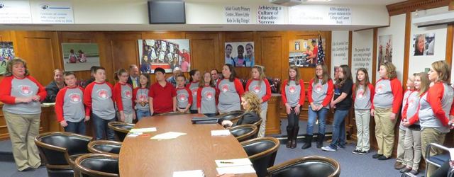 2015-03-23 - 1204 Greensburg Street, Columbia, KY - Photo by Ed Waggener. The highlight of every school board meeting are the presentations by the kids. Thursday, March 19, 2015, was no exception. The Adair County Elementary School Governor's Cup team, above, led the pledge of allegiance. The team, coached by Jeana Pike (Future Problem Solving) and Lisa Newell-Hare (Quick Recall), are, in no particular order, Noah Newell, Elizabeth Smith, Gracie Baker, Amber Loy, Kiara Collins, Kennedy Stephens, Luke Stotts, Sadie Kemp, Briley Burns, Kami Pike, Mirah Murphy, Jacob Polston, Angelina Firkins, Kalli Bailey, Colin Stephens, Colin Pike, Madeline Hardwick and Leah Dykes. The group was introduced by their principal, Steve Burton. Board Members and the audience stay an extra 5 or 10 minutes because of the visits, but never complain, and frequently remind others that the appearance of the kids at the outset sets the tone for the meetings, a reminder, Supertintendent Reed says, that "Everything we do is about the kids."