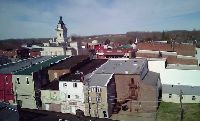 2015-03-22 - Columbia, KY - Photo by Graham Waggener. Graham took this aerial photo of Downtown Columbia last week. The patterns in the paint and the rooflines make a really neat photo particularly if the scene were compared to just a few years ago, before owners of buildings on the Square started seeing the potential on the alley way entrances. - CM
