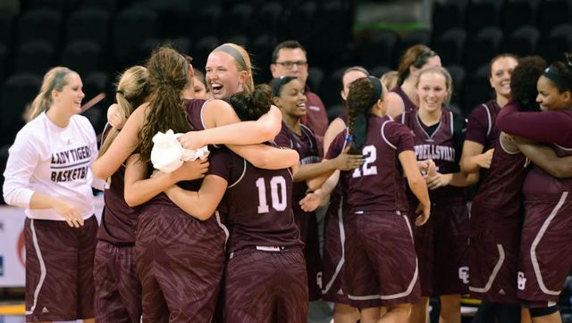 2015-03-22 - Independence Events Center, 19100 E Valley View Pkwy, Independence, MO - Photo - Courtesy of Richard RoBards / CU Sports Information. Macie Spence embraces her teammates after Campbellsville came back from being down 19 points in the second half to beat Bethel University, 73-64. - Richard RoBards.