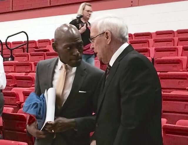 2015-03-21 - Adair County High School, 526 Indian Drive, Columbia KY - Photo by Ed Waggener. A high ranking member of Gov. Steve Beshear's administration, Colmon Eldridge, accompanied the Governor to Adair County High School Thursday. Above, with a friend of Gov. Beshear, Junior Stotts, right of Columbia, KY. Mr. Eldridge is Executive Assistant to Governor Beshear and is a graduate of Transylvania University. He is an outstanding orator; a skill he used adroitly to get elected President of the National Young Democrats. A sample of his speaking ability is on YouTube, at Colmon Elridge on retiring Transylvania University president's legacy, friendship, when he was paying tribute to the retiring president of Transylvania University, Dr. Charles L. Shearer.