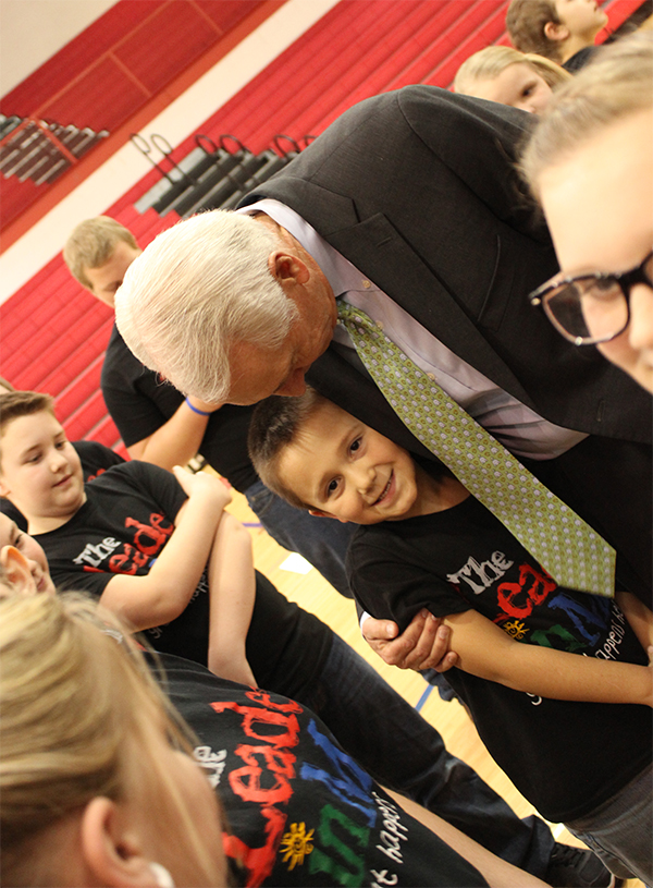 2015-03-20 - Adair County High School, 526 Indian Drive, Columbia KY - Photo by Shamarie Claiborne, Adair County School District. There were chokes and chill bumps when the kids performed and when the public synched with Governor Beshear, knowing that he was finally in his comfort zone when he mingled with the kids. A artistic shot by Shamarie Claiborne, the Governor Steve Beshear with a school favorite: Tristen Stotts.