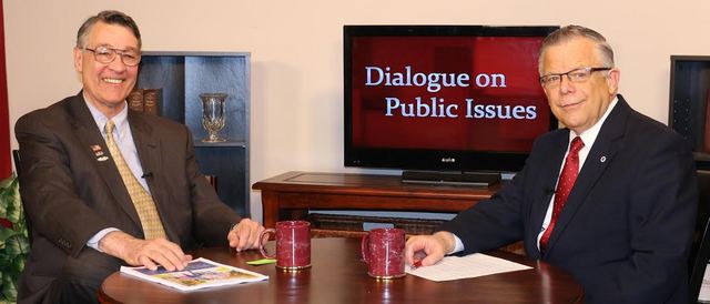 Dr. John Chowning, vice president for church and external relations and executive assistant to the president of Campbellsville University, right, interviews Will T. Scott, former associate justice of the Kentucky Supreme Court who is running for governor, for his "Dialogue on Public Issues" show. The show will air at 1:30pm/EDT and 6:30pm/EDT Monday, March 23 and at 1:30pm/EDT and 7pm/EDT Wednesday, March 25 on WLCU-TV, Campbellsville's cable channel 10 and at 8am/EDT and at 6:30pm/EDT Sunday, March 22, 2015, on WLCU-TV and on 88.7 The Tiger radio. - DREW TUCKER, CU.