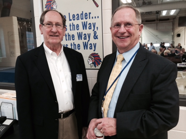 2015-03-20 - Adair County High School, 526 Indian Drive, Columbia KY - Photo by Larry Smith, FM 99.9 The Big Dawg, FM 92.7 the WAVE. After I looked closely at the picture, it was interesting to see "Leader, the Way, the Way, & the Way," in the poster behind two neighbors and close friends, Louis McQueary and Superintendent Alan Reed. It was one of the great moments during Governor Steve Beshear's visit to Columbia on Thursday. - LARRY SMITH, Operations Manager, Shoreline Communications.