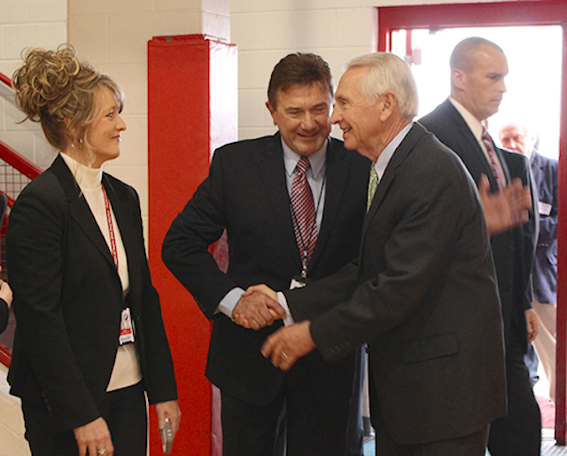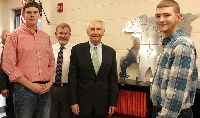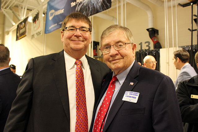 2015-03-20 - Adair County High School, 526 Indian Drive, Columbia KY - Photo by Shamarie Claiborne. Dr. Wm. T. Luckey, President of Lindsey Wilson College, and former Adair County Judge Richard Lee Walker were among the invited dignitaries for Governor Steve Beshear's visit to see Adair County High School's new Career-Tech building.