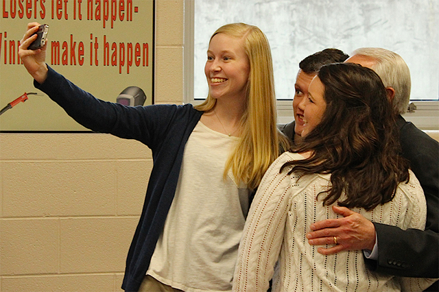 2015-03-20 - Adair County High School, 526 Indian Drive, Columbia KY - Photo by Shamarie Claiborne, Adair Co. School District . Lauren McQuaide, Ben Hancock and Susan Spinks grabbed a selfie with the Govener Beshear during his visit to Adair County Career Technical Center, Thursday, March 19, 2015.