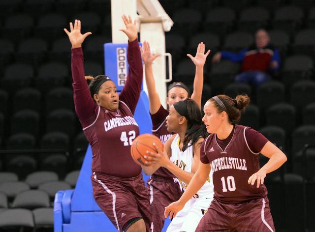 2015-03-20 - NAIA Womens National Playoffs, Louisiana - Photo by Richard RoBards, Campbellsville University . Chelsea Craig, left, LeeAnn Grider, back, and Caroline Owen, front, swarm a LSU Shreveport player in the paint. CU won its NAIA National Tournament first round game, 55-46 and will play in round two. CU Photo courtesy of Richard RoBards / CU Sports Information.