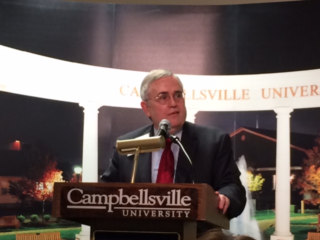 2015-03-19 - Badgett Academic Support Center (BASC), , 110 University Drive, Campbellsville, KY - Photo by Larry Smith, FM 99.9 The Big Dawg, FM 92.7 the WAVE. Al Cross addresses the packed banquet hall in the Badgett Academic Support Center on the campus of Campbellsville University, at noon today, Thursday, March 19, 2015. - LARRY SMITH, Operations Manager, Shoreline Communications.