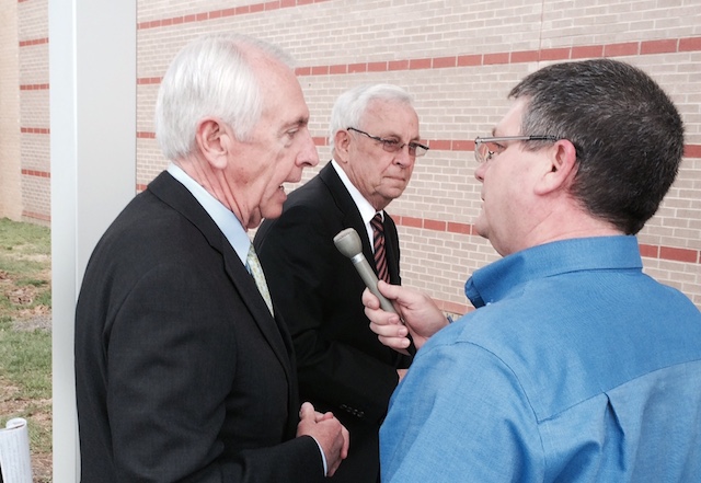2015-03-19 - Columbia, KY - Photo by Ed Waggener. Governor Steve Beshear was interviewed this afternoon by Larry Smith just outside the Adair Co. High School Gym. In the background is his friend, Junior Stotts, who accompanied the governor from the Russell County Airport. Gov. Beshear is touring the Career Tech Center, before returning to give a talk to a group of students and the public. Larry Smith said that he told the Governor that he's looking forward to interviewing Andy Beshear soon on his radio stations.