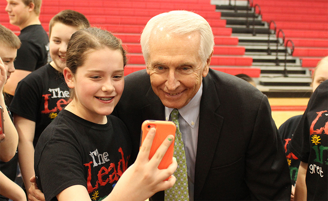 2015-03-19 - Adair County High School, 526 Indian Drive, Columbia KY - Photo by Shamarie Claiborne, Adair Co. School District . Governor Beshear had animated interest as Amber Loy takes a selfie with her iPhone during the Governor's visit to Adair County High School today.