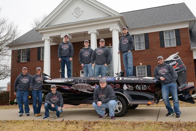 2015-03-19 - Campbellsville University, Campbellsville, KY - Photo by Richard RoBards, Campbellsville University . Campbellsville University's new bass fishing team includes from left: Front row - Tommy Hall, head coach; Rachel DeCoursey of Hopkinsville, KY; Austin Moore of Bowling Green, KY; Travis Hunt and Mason Sapp, both of Campbellsville, KY Back row - Hunter Pierce of Liberty, KY; Alan Bailey of Campbellsville; Dakota Cantrell of Monteagle, TN; and Cameron Brooks of Greenville, KY. The inaugural Campbellsville University co-ed bass fishing season will launch Friday morning, March 20, 2015, at 7amCT from the boat docks at Moor's Resort, 570 Moors Road, Gilbertsville, at 7amCT, each day. Weigh-in will be held lakeside each day beginning at 3pmCT. Takeoffs and weigh-ins are free and open to the public. - CHRIS MEGGINSON