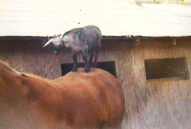 Hamlet the pygmy goat, on Daiquiri the Quarterhorse's back, ready to ride. - Peg Schaeffer