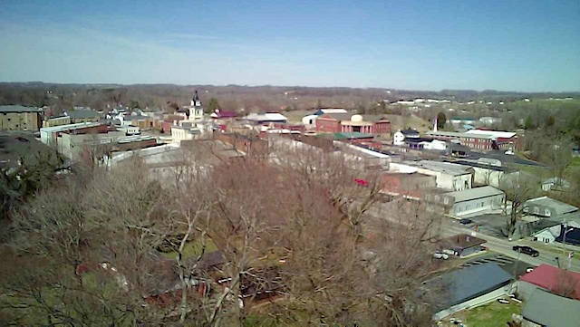An aerial view of downtown Columbia, taken from high above Fortune Street. To the right cars can be seen driving on Jamestown Street. The steeple visible on the far right is Columbia Christian Church on Campbellsville Street.