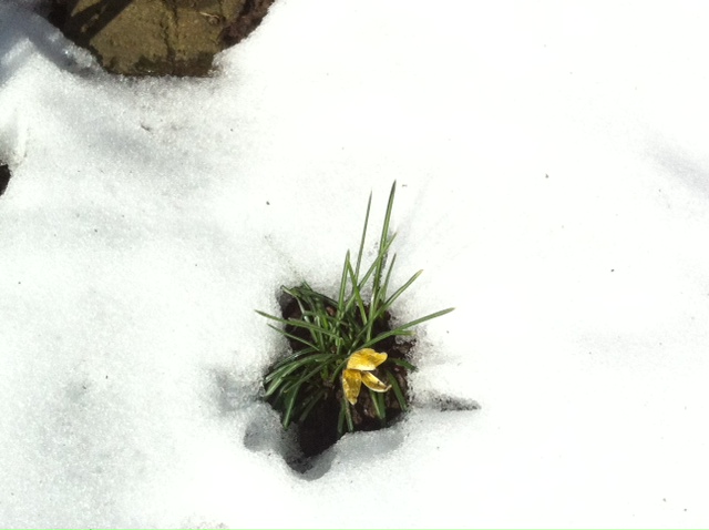 2015-03-08 - Harrodsburg, Mercer County, KY - Photo by Mike Watson. "A valiant effort by a little Crocus blossom," Mike Watson writes, with this photo of one of nature's earliest heralds of spring. (Sun 8 Mar 2015), and so it's on to the next harbinger, Daffodils. Usually, by this time, we've had a bunch of Daffodil photos, and as far as we're concerned, we'll never reach 'critical mess' with daffodil pictures.