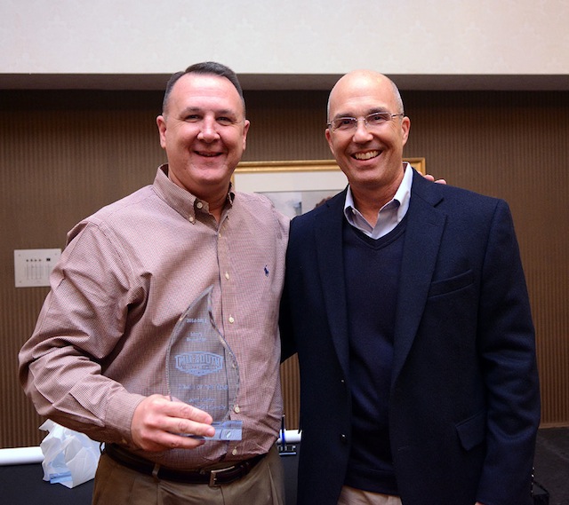 2015-03-06 - Campbellsville, KY - Photo courtesy Jordan Alves, Campbellsville University. Mid-South Conference Commissioner Eric Ward (right) presents Campbellsville University head coach Keith Adkins with the MSC Men's Basketball Coach of the Year award.